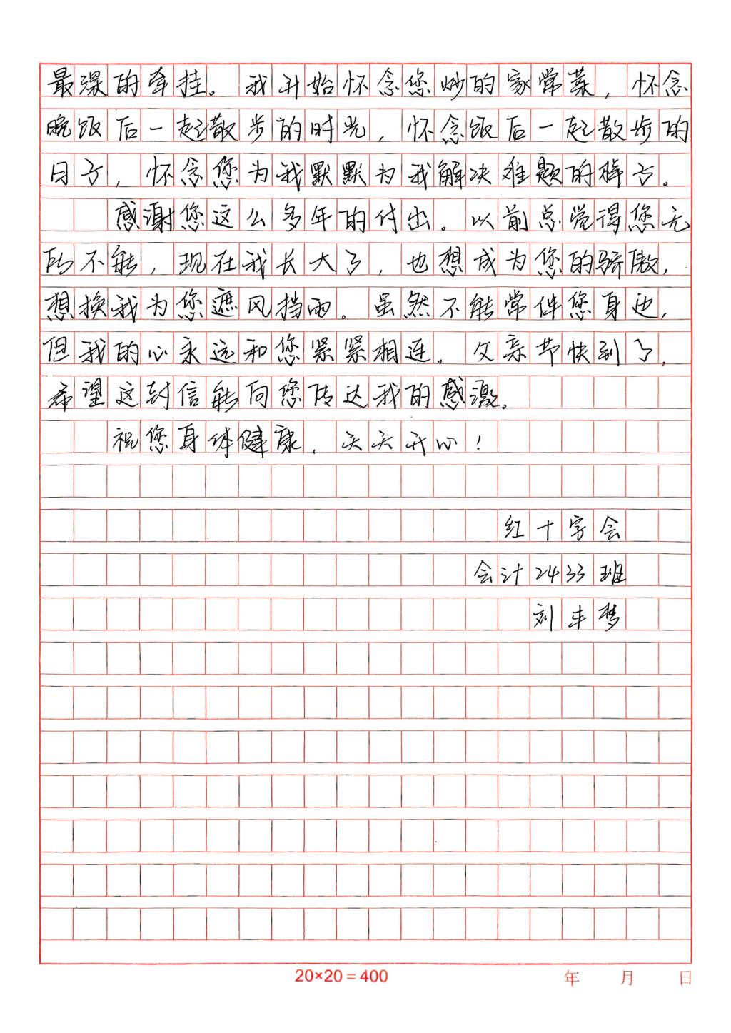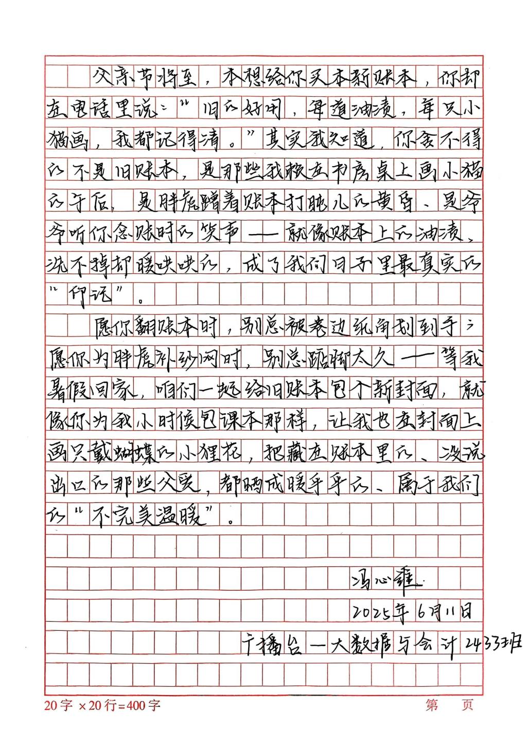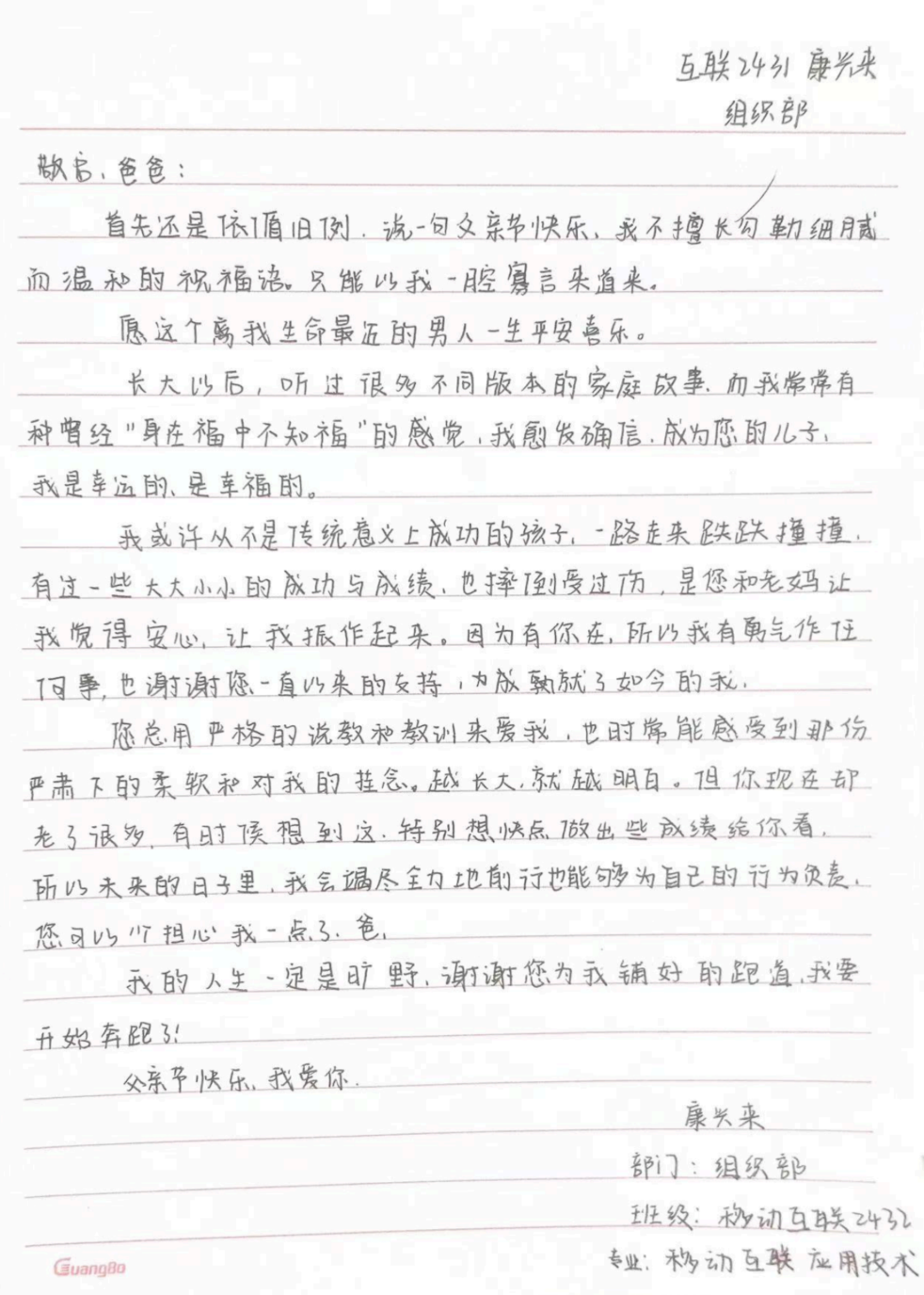 此次父亲节系列活动,将叙事分享与情感表达相结合,让同学们在温馨氛围中回忆与父亲相处的点滴,不仅加深了学院青年对父爱的理解和感悟,也促进了学生与家长之间的情感沟通,增强了家庭成员间的凝聚力。同时也提升了学院青年对于“家庭,家教,家风”的理解与认识,为校园文化注入了新的活力,展现了学院青年的良好精神风貌,为推进学院高质量发展贡献了青年力量。