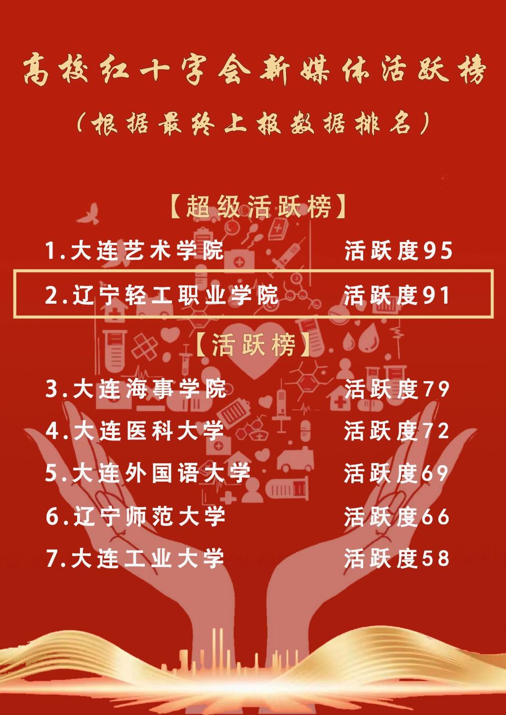 为进一步激发各高校红十字会学生分会的工作热情,弘扬“人道、博爱、奉献”的红十字精神,大连市红十字青少年工作委员会发起高校红十字会新媒体活跃榜评选活动。本次评选综合评估各高校新媒体平台的发文量、阅读量、转发量、投稿量等,经过一系列的统计和计算,我校红十字会在2025年下半年的活跃指数排名全市第二名。